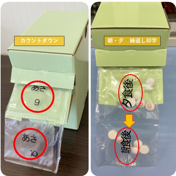 おっしゃる通り残りが分かりづらいので、日付を入れない場合はカウントダウン形式でナンバリングしたものを充填しています。また日付記入の際はお薬束®の天井面に付箋紙もしくは、マスキングテープで終わりの日付を記入しています。