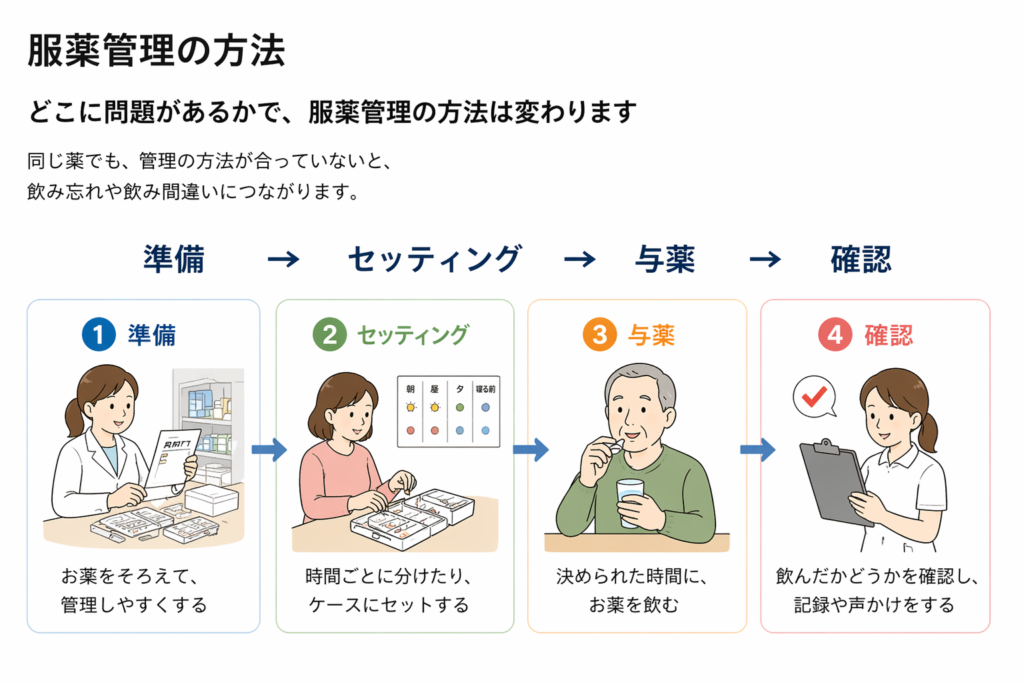 服薬管理は、薬を準備、セット、飲む、確認するまでの流れで成り立っています。