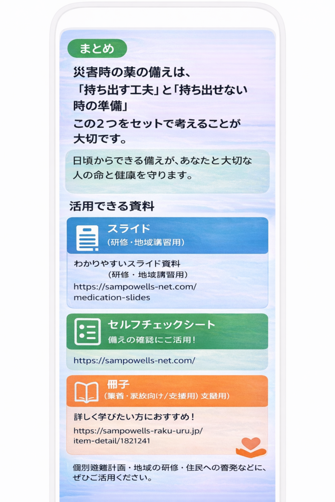 災害時の薬の薬の備えについて、ご紹介しましたが、まとめとしてセルフチェックシートを作成しました。災害医療に携われました 西口 工司教授(京都薬科大学 医療薬科学系臨床薬学分野)に、冊子を含めご監修いただきました。薬を備えるきっかけになれば、うれしいです。また、自治体をはじめとする危機対策・福祉関係の方々にも、個別避難計画等の参考にしていただければ幸いです。