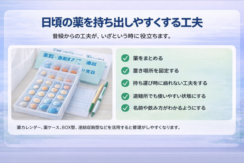 | 定期薬を持ち出しやすくする | ・避難所でも、慣れた薬を慣れた飲み方で服用できる ・処方に時間がかかったり待つことが不要 | ・移動時にばらばらにならないよう注意 ・日ごろから固定(習慣)化した場所に置く ・避難先でも使いやすいか要検討 |